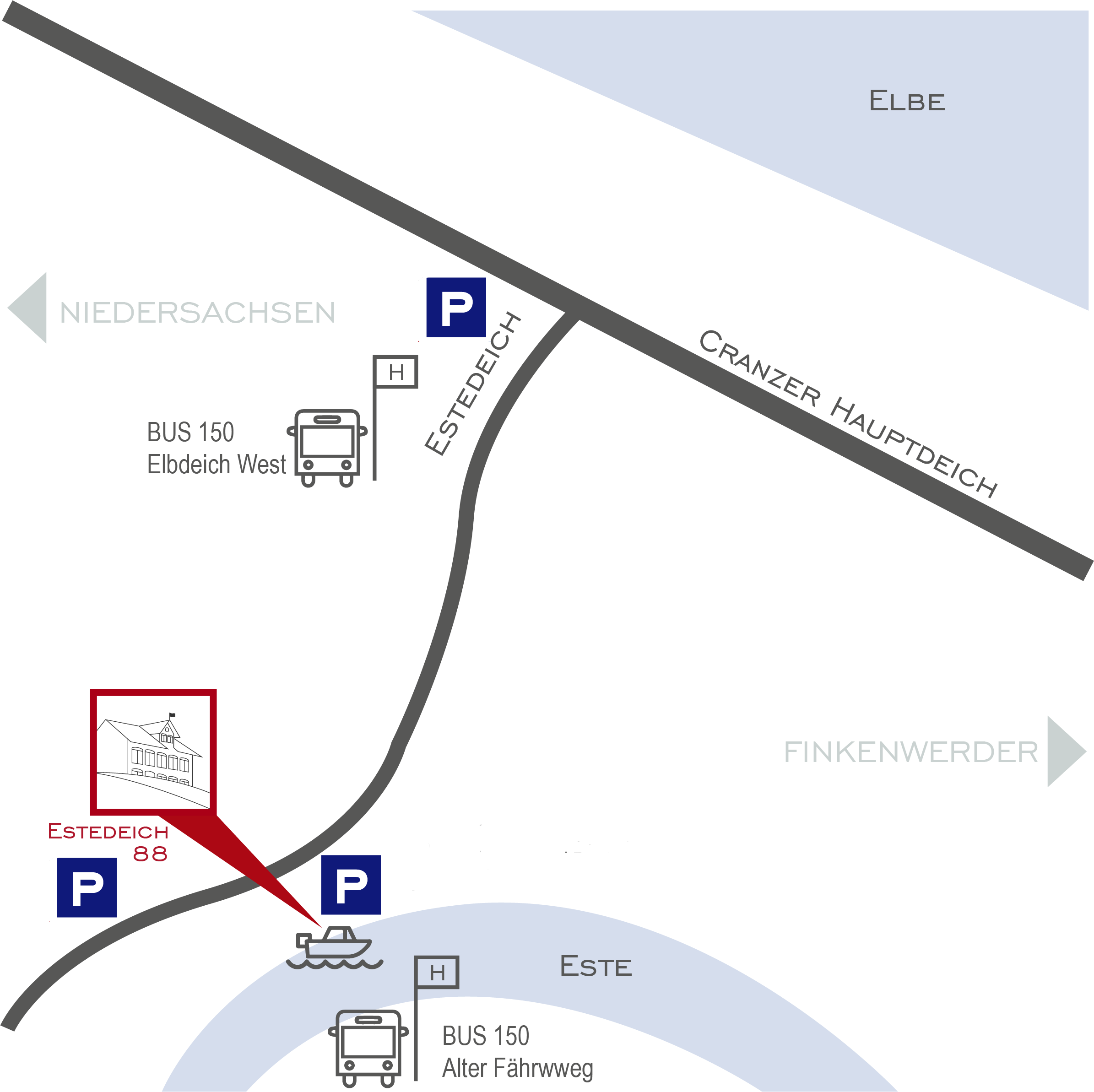 Unsere zweites Ausrufezeichen setzt unsere Lage am Elbdeich in Hamburg & dem Alten Land. Direkt am Wasser lassen sich im Sommer unter blühenden Kirschbäumen im Mai vorbeifahrende Boote beobachten oder im Juli die Kirschen als Dessert direkt vom Baum essen.